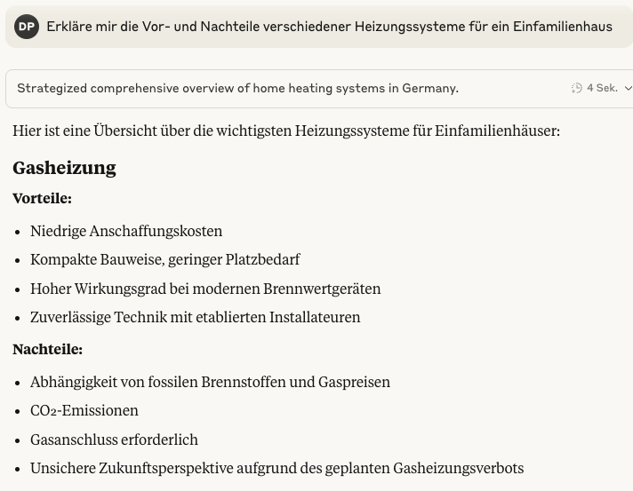 LLM-Anfrage: "Erkläre mir die Vor- und Nachteile verschiedener Heizungssysteme für ein Einfamilienhaus"